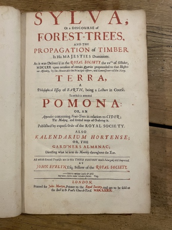 John Evelyn.Esq. SYLVA, OR A DISCOURSE OF FOREST-TREES, AND THE PROPAGATION OF TIMBER IN HIS MAGESTIES DOMINION... London: John Martyn, 1679. third edition. 412 pages + 38 Kalendarium Hortense + errata page. a very good, very clean, very readable book of advice for the forrester and gardener. a VG disbounded copy, needing restoration.