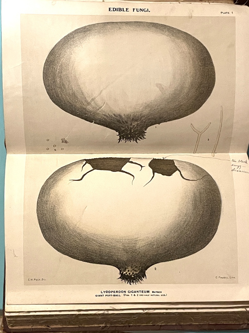 Charles H. Peck. PECK ON FUNGI. REPORT OF THE STATE BOTANIST. 1894. New York State Education Department: Albany, 1894. 8vo. ½ leather with brown cloth. 337pp Report of the State Botanist being a description of the fungi. some marginalia, plus 43 linen backed, full page chromolithograph plates of fungi. 39 edible, 3 poisonous and 1 unwholesome. rare first compilation of this study. as 1 volume and the first issue of this report. scarce in this presentation. $425.