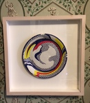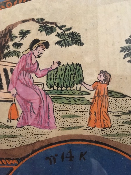 This is a dominotier for an éventail or handfan. The bright colors are reminscencent of Tarascon fabric-- at least to me. It's in the shop until I'm ready to part with it-- bright and charming and framed with provenance seems to have been a museum deaccession. $950.